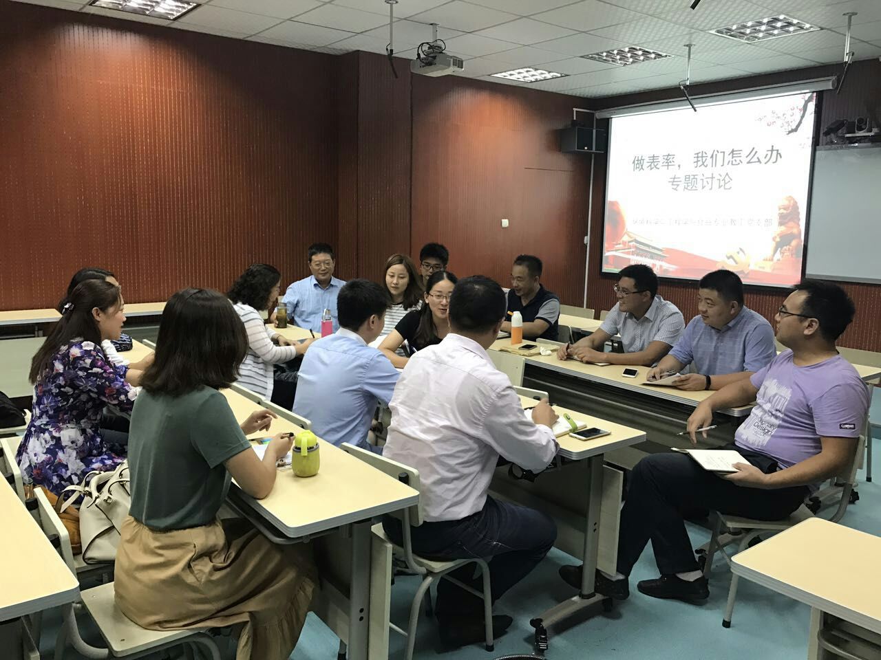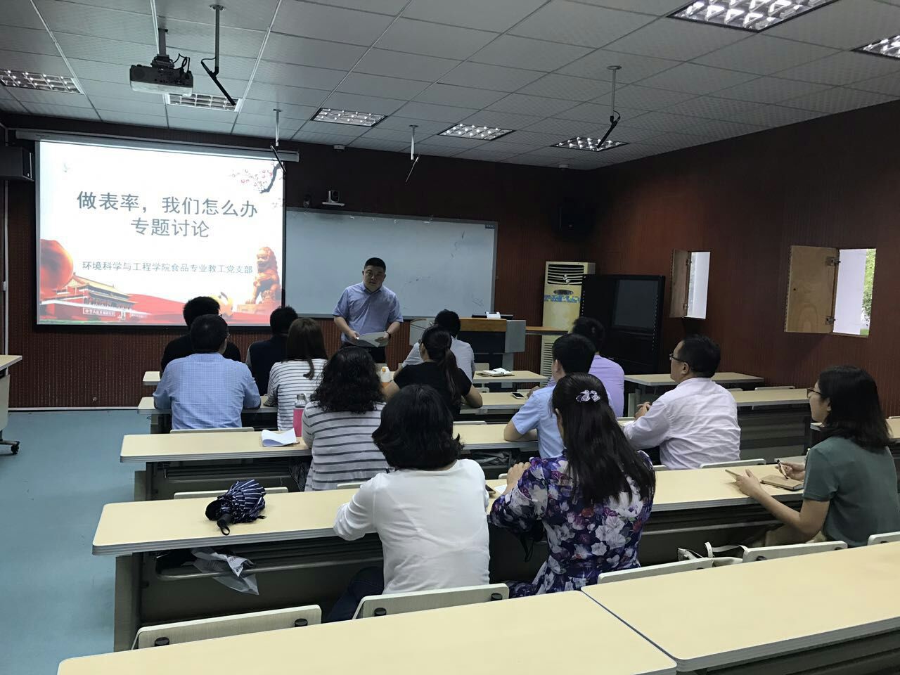 为深入推进“两学一做”学习教育常态化制度化,扎实开展“讲政治、重规矩、作表率”专题警示教育,2017年9月13日,环工公司食品专业教工党支部在行政楼一楼会议室召开“作表率,我们怎么办”专题讨论会。会议由支部书记刘辉主持,支部全体党员参加。