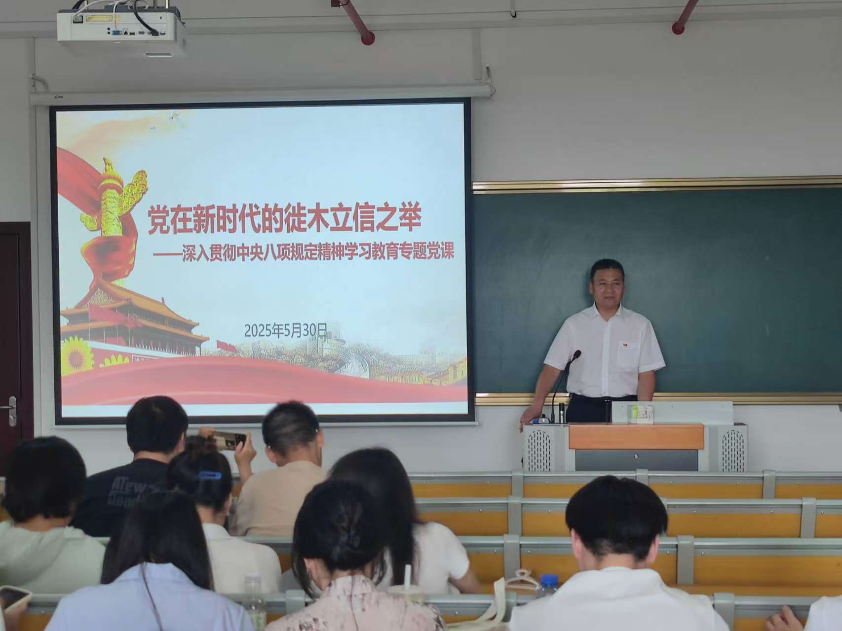 胡好远为支部党员上了题为《党在新时代的徙木立信之举》的专题党课。他介绍了中央八项规定和中央八项规定精神的内容与区别,中央八项规定实施的成效,通报了高校违反中央八项规定精神的典型案例,结合员工实际,详细阐述了员工党员如何落实中央八项规定精神。学习研讨环节,与会党员观看了警示教育片《永远吹冲锋号》视频,全体党员共读了《习近平关于加强党的作风建设论述摘编》第一章的内容。于红梅领学了习近平总书记的重要文章《激励新时代青年在中国式现代化建设中挺膺担当》,倪世春领学了习近平总书记在庆祝中华全国总工会成立100周年暨全国劳动模范和先进工作者表彰大会上的重要讲话精神。研讨交流环节,五位党员结合学习、工作、生活情况作研讨发言。