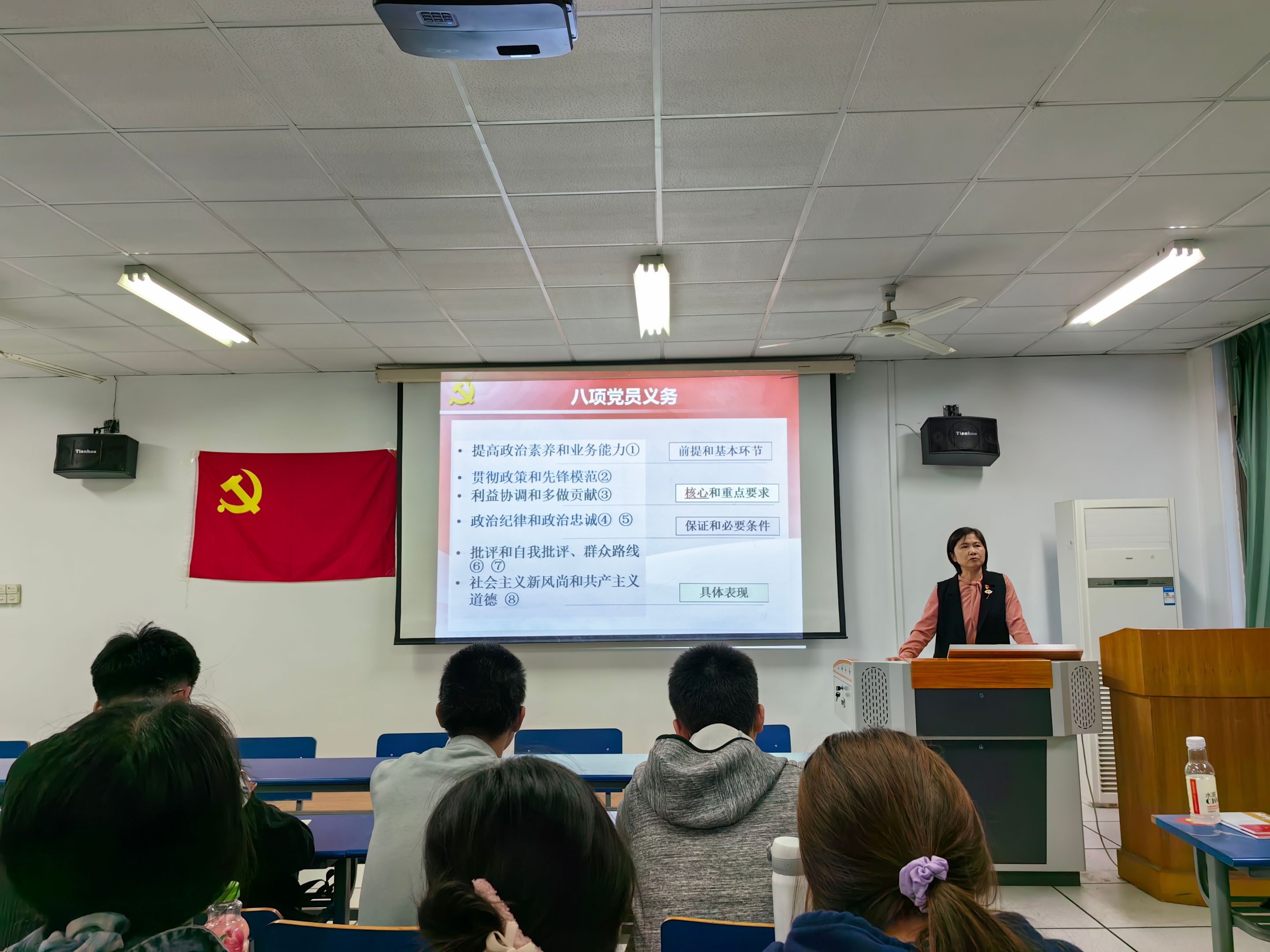 杨友谊详细讲解了党员义务与权利,指出要成为党员,必须提高政治素养和业务能力,做先锋模范,将个人利益与国家利益相结合,注重政治纪律,做到批评与自我批评,走群众路线,坚守社会主义新风尚和共产主义道德。她指出,做一名合格的员工党员,要坚定共产主义信念,全面发展、服务奉献、遵纪守法、弘扬正气,要树立社会主义荣辱观,建设良好的人际交往关系与心理素质,为实现中华民族的伟大复兴而认真学习、努力奋斗。她希望全体学员通过学习与实践牢固树立共产主义的远大理想,努力学习科学文化知识和专业技能,提升综合能力,积极践行社会主义核心价值观,不论是在本职岗位还是在家庭和社会中都尽到自己的责任与义务,发挥表率和模范作用,用行动积极向党组织靠拢。