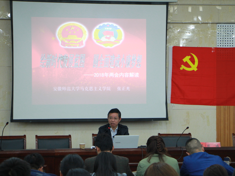 张正光老师从“‘两会’发展历程”、“‘两会’历史场域”、“‘两会’议程”以及“‘两会’核心内容”四个模块展开,并对2018年两会内容进行了解读。他用一次华丽转身,两个历史时期,三大治理难题,完美的概括了“两会”召开的历史场域,指出党的领导包括决策权,执行权和检察权,强调了党的领导的核心地位。在简要介绍“两会”的议程后,张正光主要从对过去五年的工作回顾、2018年经济社会发展总体要求和政策取向及对2018年政府工作的建议三个方面带领大家详细地解读了《政府工作报告》,强调了我国进入中国特色社会主义新时代、主要矛盾转化等背景,突出了供给侧改革、着力创新、全面深化改革、对外开放等政策方向,阐明了打好三大攻坚战、乡村振兴战略、扩大消费等政府工作建议。最后,张正光又重点解读了《深化党和国家机构改革方案》、《宪法修正案》等文件,突出了设立国家监察委员会、颁布国家监察法的重要意义。