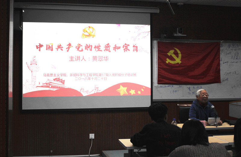 黄翠华教授就中国共产党的性质和宗旨为党课培训班的同学进行授课。培训课上黄翠华老师以她的个人经历为本场培训的主线,讲述了她与中国共产党的故事。黄老师向我们讲述了她的三次入党历程,以她不忘初心,多年来对党坚定不移的忠贞,向我们传递了一个党员应具有的素养与操守。其中在讲述她的老员工涯时,她亲切的勉励我们老员工要有明确的目标,并且为之不断的努力,做一个“忙碌”的老员工,努力充实自己的老员工涯。黄翠华老师还劝诫培训班的全体学员在前进的道路上要交两个朋友——图书馆和运动场,并对大家提出期望,希望大家要常怀感恩之心、进取之心、乐观之心、包容之心。最后通过提问环节,黄翠华老师解答了学员们在生活学习以及未来发展的一系列问题,学员们纷纷表示收获颇丰。