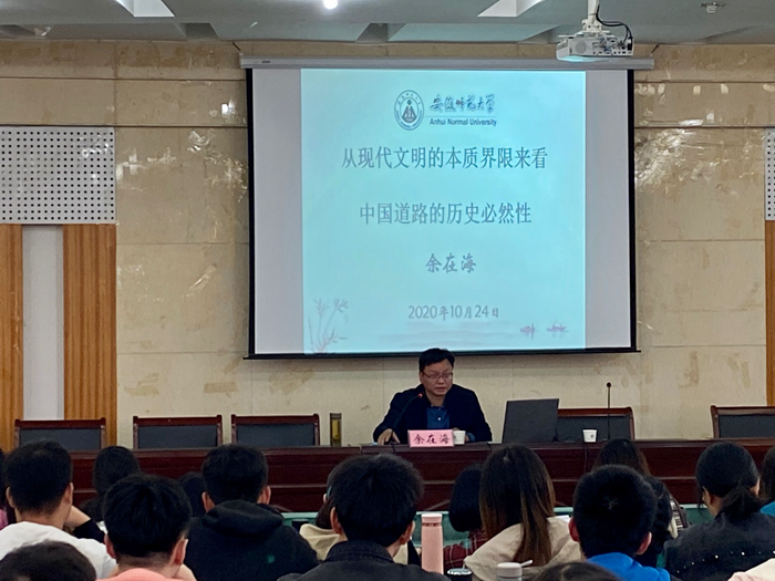 讲座伊始,余在海先从为什么要解读“中国道路”的问题入手,强调老员工党员的第一要务是认真学习,通过学习深刻理解马克思主义,理解中国道路。之后,余在海从中国道路问题的缘起及其解决方法、现代文明的本质及其界限和基本结论三个方面解读中国道路。在近两个小时的讲座中,余在海教授用翔实的案例,深入浅出地讲解了如何用马克思主义历史的、批判的世界观与方法论来研究中国的未来向何处去的问题,中国如何成功地走出一条不同于西方的现代化道路。
