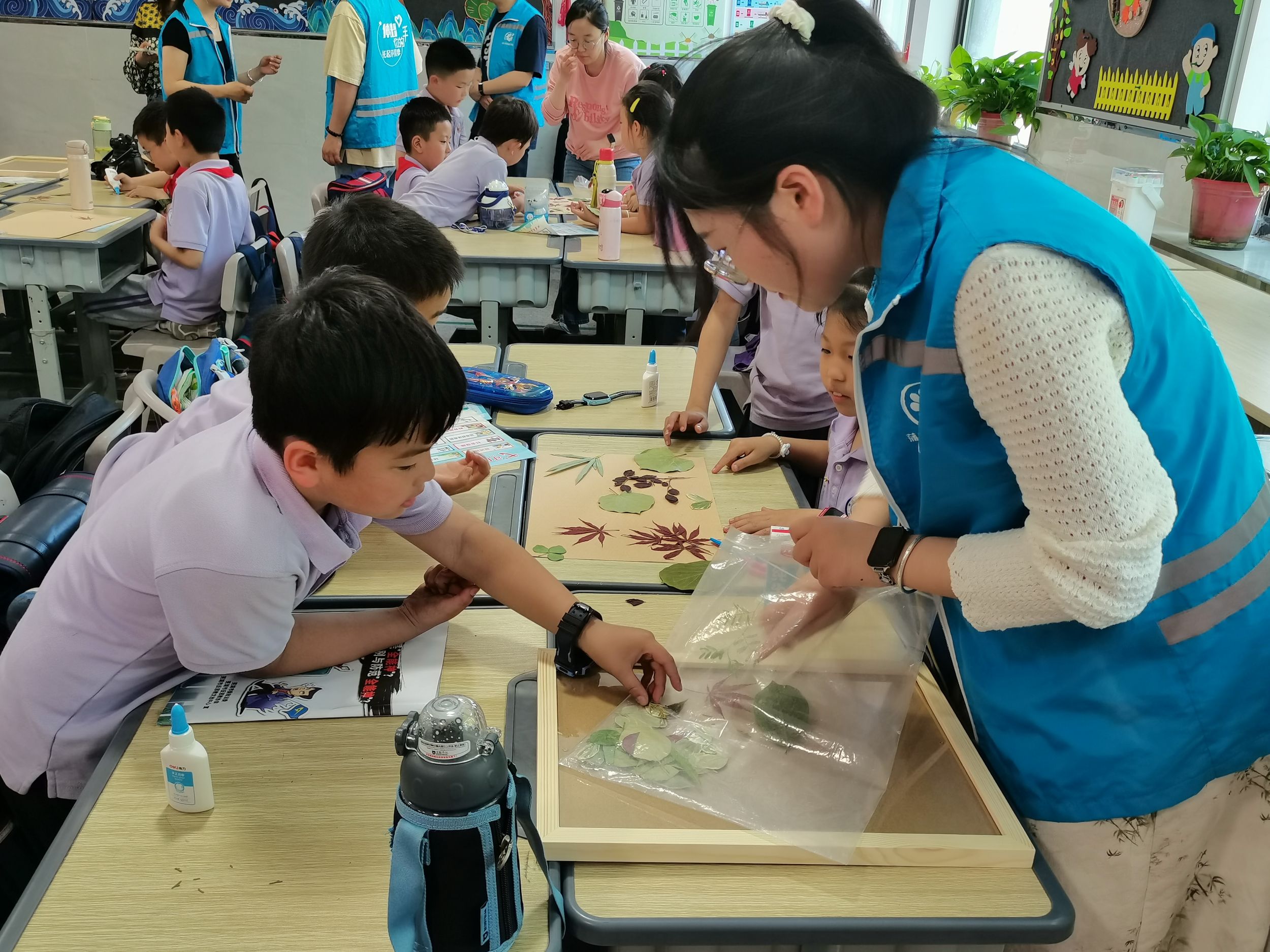 在植物标本制作环节,蒲公英环保公司的志愿者带领同学们一起认识提前收集风干好的叶片、花草的学名和特性,分组进行了特色创作活动,让理论知识与实践相结合。志愿者们引导同学们把树叶和干花精心贴至于画框内,并在每种植物旁边贴上对应的种名。此外志愿者们还指导同学们将多余的叶片进行塑封保存,不仅使得精美的作品得以长久的保存,也激发了同学们保护生物的意识。