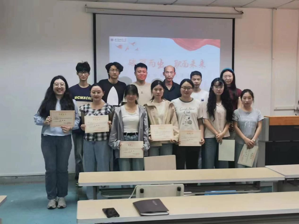 王根宝针对大家设计的简历和PPT进行点评。他指出,PPT需要进一步精美优化,增加与求职岗位的匹配度,要着重凸显出自己与目标岗位契合的特点等。最后,评委老师分别从个人简介、自我评价、版面设计、创新发展四部分对参赛作品进行评分,最终评选出特等奖2名,一等奖2名,二等奖3名,三等奖6名。