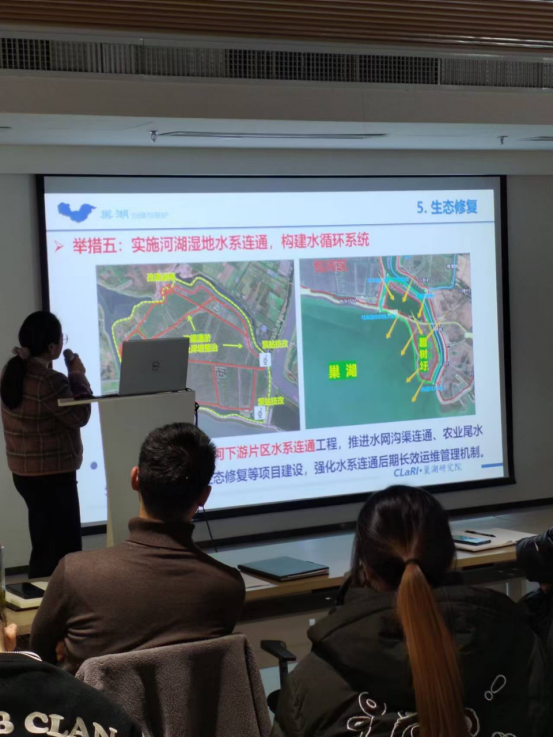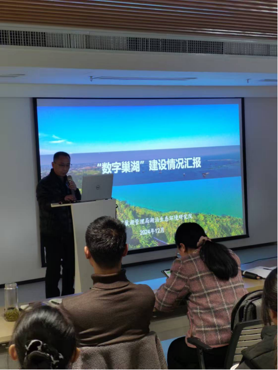 6日上午,公司师生一行首先来到巢湖管理局湖泊生态环境研究院,受到了水文水资源部部长齐鹏云高级工程师、技术集成部工程师、公司员工王怡慧博士以及数据资源部罗振宇和童文平工程师的热情接待。简短欢迎仪式后,王怡慧以“巢湖综合治理历程与展望”为题,从巢湖治理背景、巢湖流域概况、巢湖治理历程、巢湖治理长期规划与展望、巢湖治理目标、思路与成效和巢湖治理主要做法等6个方面系统详实地介绍了巢湖综合治理措施、成效和目标等。齐鹏云以“数字巢湖建设”为题,从建设背景、需求目标、实施项目和存在问题等方面讲解了巢湖治理精准智慧管控的有关情况,主要是通过把现实中的巢湖数字化和可视化的途径满足巢湖综合治理的需求。报告会后,同学们就关心的话题与两位专家互动交流。两位专家精彩的报告以及对公司人才培养的关心关爱得到了与会师生的高度评价。双方还就加强未来合作进行了初步沟通交流。