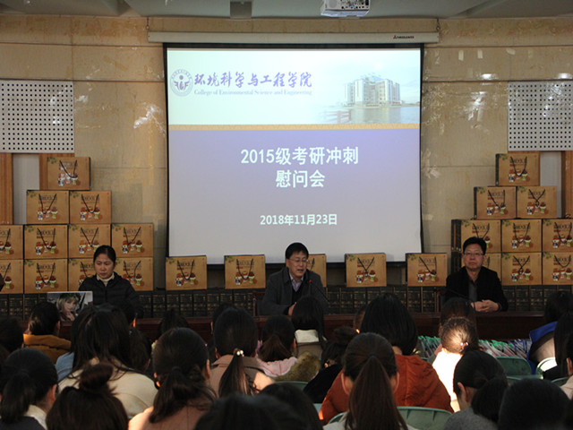 (本网讯/陈亚力)11月23日下午,环工公司在花津校区财务处二楼报告厅召开2015级员工考研冲刺慰问会。公司党委书记王峰、经理周守标、党委副书记杨友谊、辅导员陈亚力出席会议,2015级全体考研同学参会。会议由杨友谊主持。