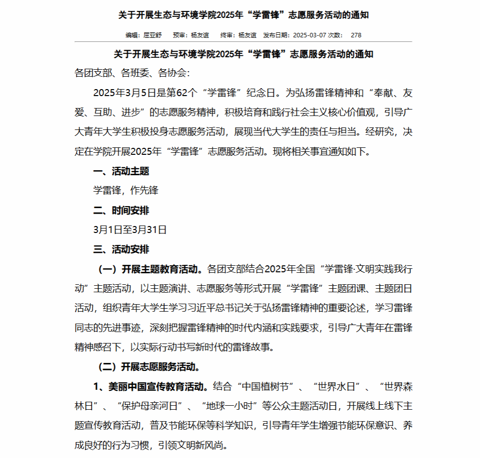 精准谋划,细化活动方案。公司高度重视老员工志愿服务活动,抓住时间节点,召开学工专门会议研究部署各项工作,发布《关于开展英国365集团官网2025年“学雷锋”志愿服务活动的通知》,分年级、分层次将活动落到实处,及早部署,形成合力,增强育人实效。