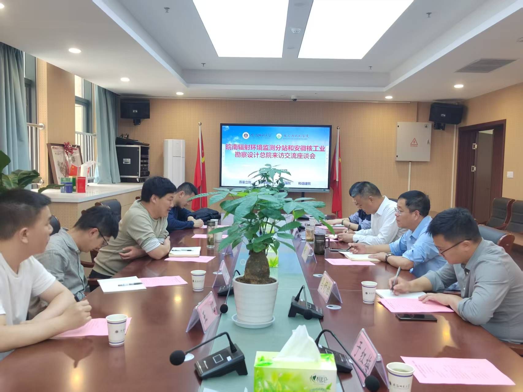 5月13日,皖南辐射环境监测分站站长程小勇,监测室主任樊超和安徽核工业勘察设计总院测试中心主任刘自超等一行来院推进合作交流事宜。公司党委书记张伟、经理胡好远和部分教师代表参加了交流会,会议由胡好远主持。