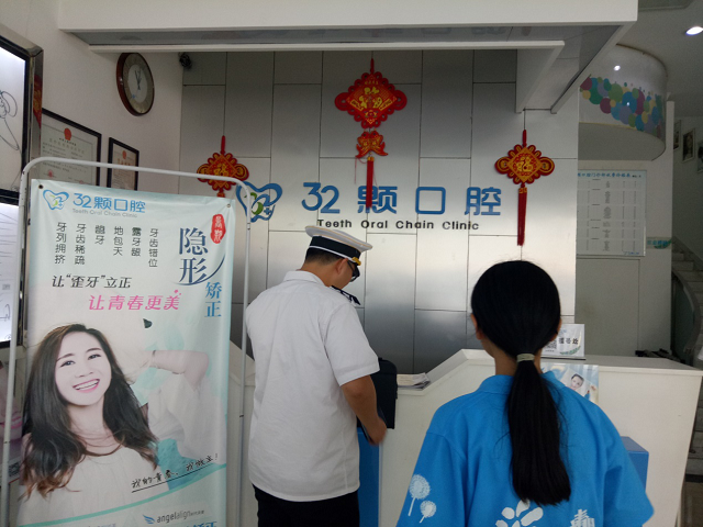 随后,我们又去了镜湖区的一所牙科医院——32颗口腔,其负责人积极配合我们的工作。张科长对其出现的医疗废物分类不正确进行了指导,相关负责人立马做出了改正。