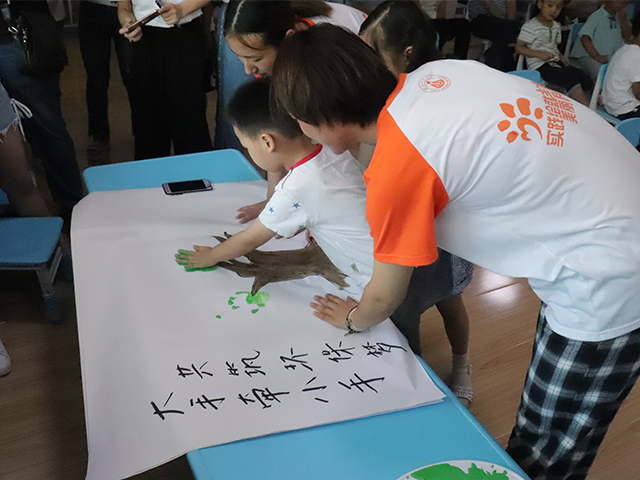 环保课堂,播撒希望。随后的环保小课堂中,志愿者们以“爱护森林”为主题,通过丰富有趣的课件为小朋友们讲解了森林有什么作用、为什么要保护森林等问题。在课堂上,志愿者们与小朋友们进行了互动,小朋友们热情高涨,积极回答问题。最后,志愿者们带领孩子们一起在纸上印上绿色的手印,象征着“大手牵小手,共筑环保梦”这一主题。