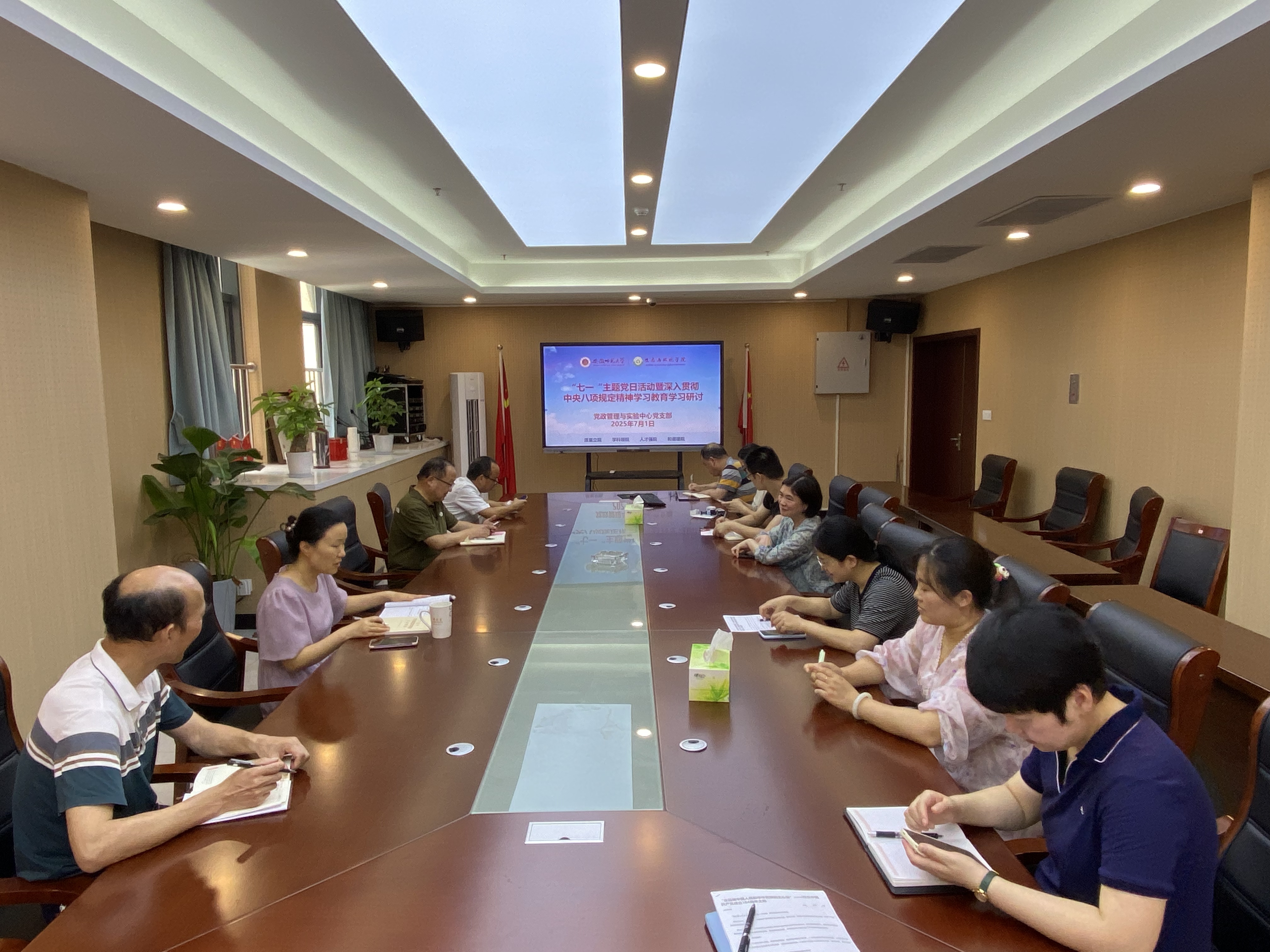 7月1日上午,党政管理与实验中心党支部在清源楼B305会议室开展“七一”主题党日活动暨深入贯彻中央八项规定精神学习教育学习研讨,支部全体党员参加了会议。会议由支部书记卫正梅主持。