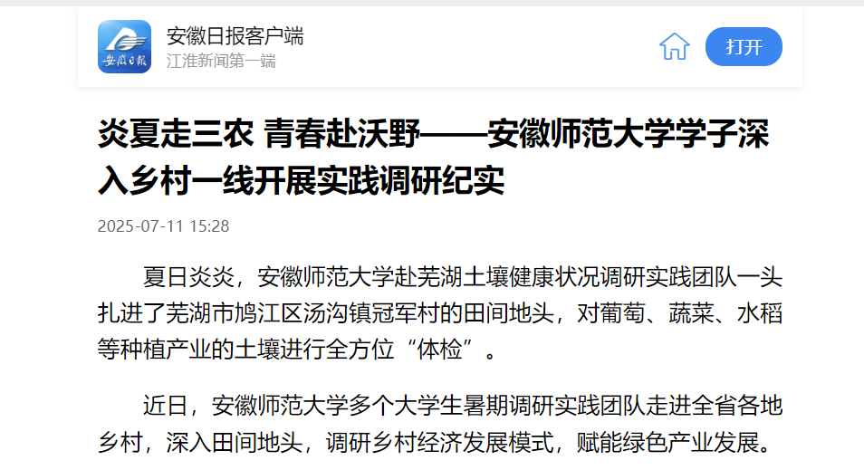 从“科技赋能”的霍山石斛秘境,到“循环经济”的繁昌稻虾沃野,再到“山水人文”交辉的魅力舒城,生态与发展的和谐共生是乡村振兴的时代答卷,实践队员的探索也为“绿水青山就是金山银山”理念注入了鲜活的青春注解。 他们形成的土壤健康报告、石斛产业调研、稻虾模式分析等一项项实践调研成果,正是执笔描绘这幅画卷、激活这片沃野的一股青春力量。