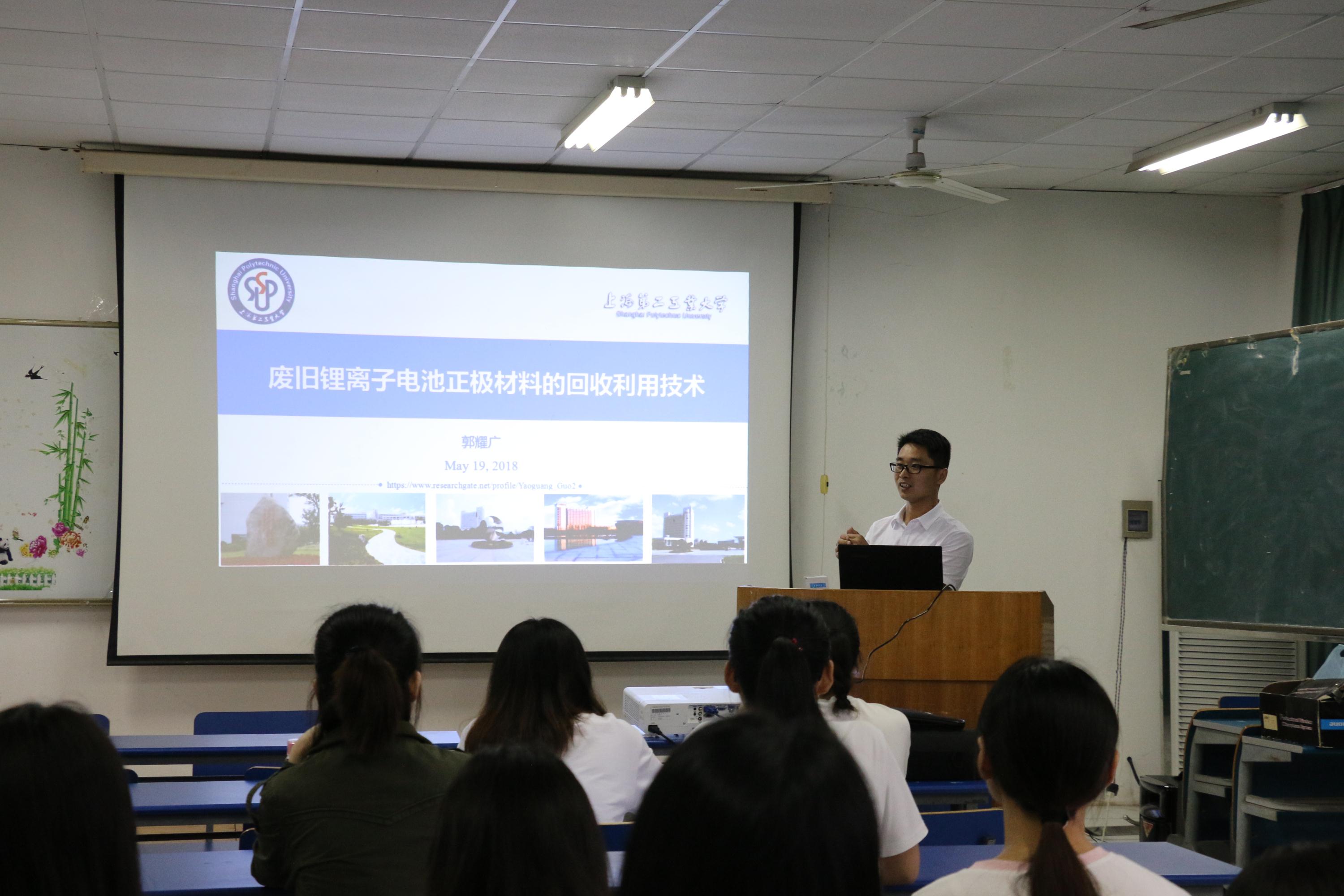 2005级员工、上海第二工业大学郭耀广副教授汇报了《废旧锂离子电池正极材料的回收利用技术》。随着智能手机、电动汽车的普及和推广应用,大量废旧电池亟待处理。“电子废弃物资源化”是上海第二工业大学的优势与特色研究领域。郭耀广副教授已成为该领域的学术骨干,他首先介绍了锂电池的结构和目前主要的回收利用技术,并从回收液的配比、反应条件优化、电极材料预处理等方面阐述了在锂和钴两种正极材料回收中取得的研究成果。