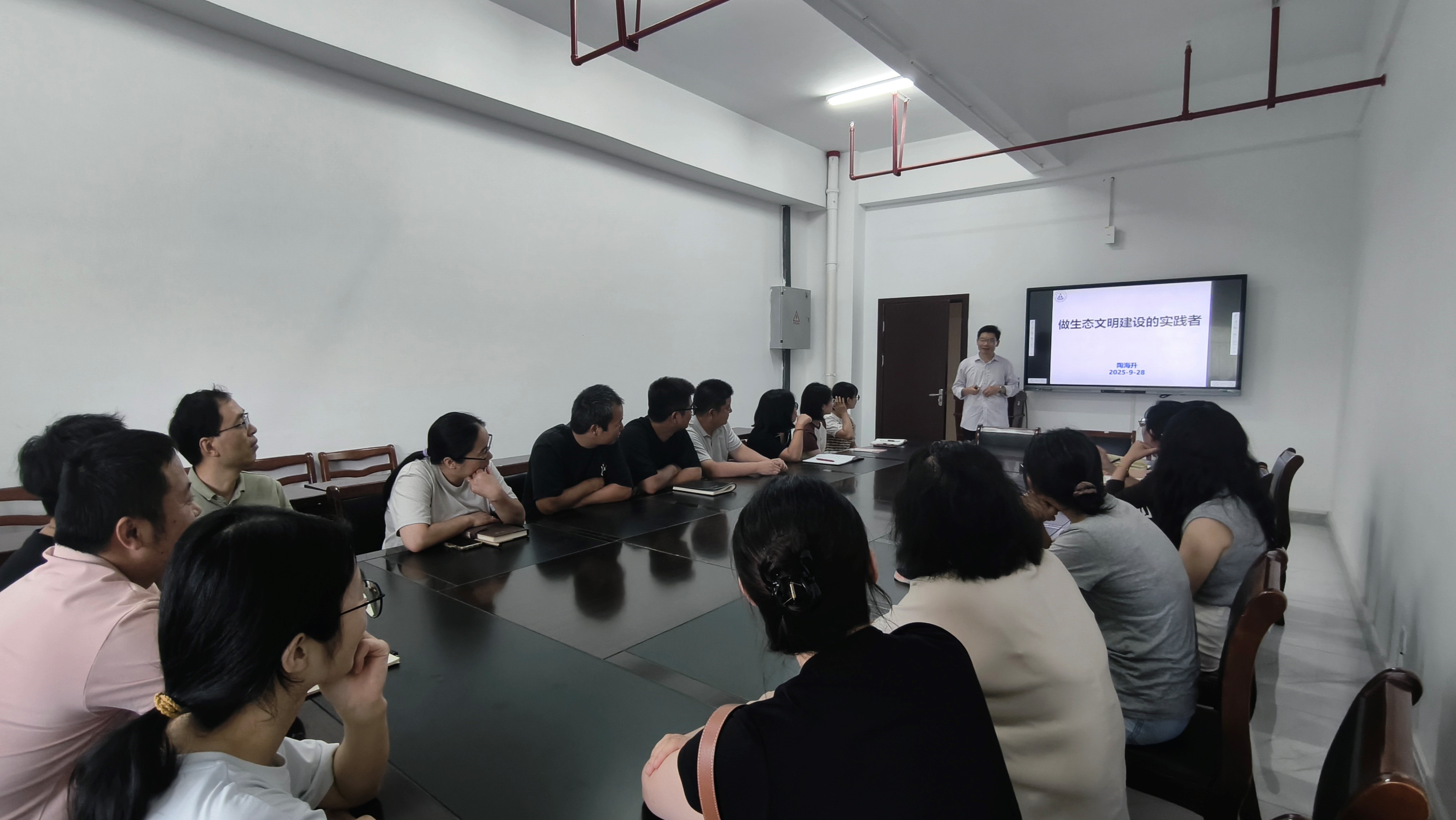 9月28日下午,环境专业教工党支部在清源楼B301会议室召开支部大会,支部书记陶海升作题为“做生态文明建设的实践者”的专题党课,支部全体党员参加会议。