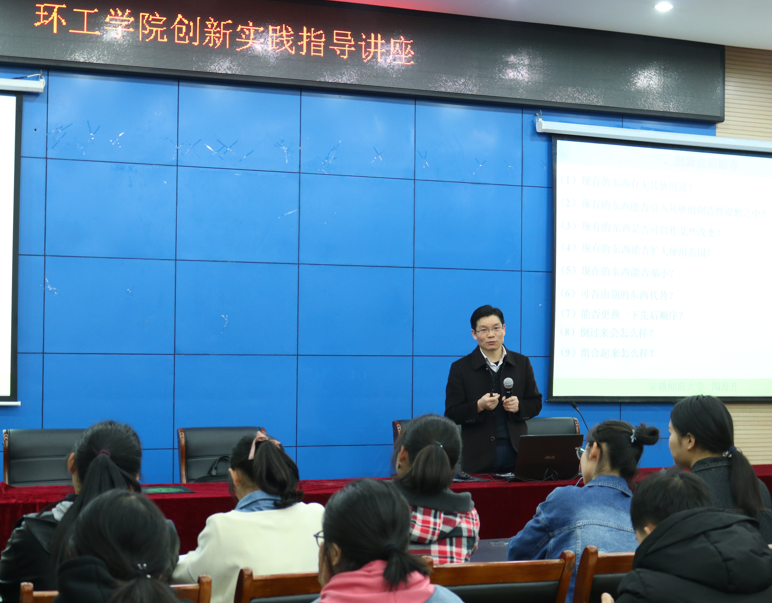 (环工公司 文/翟雯萱 图/汪俊杰)为培养员工创新意识,提高专业技能,鼓励员工积极参加各级各类学科竞赛活动,3月25日晚,公司邀请陶海升老师在圆形报告厅举行“创新实践专题”讲座。公司党委副书记杨友谊及全体2017级本科生参加,本次讲座由17级辅导员蒋亚飞主持。