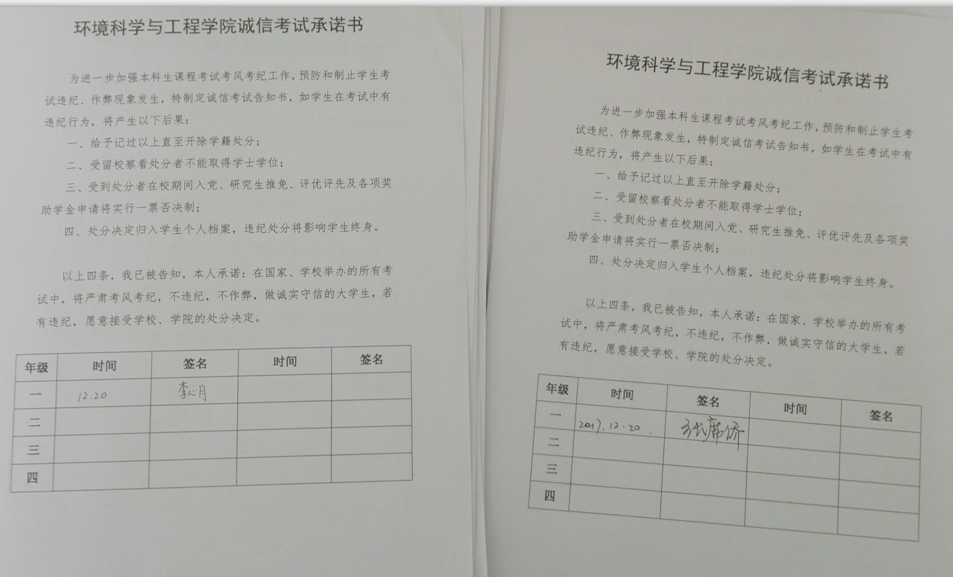 诚信考试,郑重承诺。期末考试是对知识和能力水平的检验,也是对道德和诚信的考验。公司印发《诚信考试承诺书》,承诺书中详细地列出了考试违纪将产生的后果。同学们仔细阅读告知书,郑重地签下了自己的名字。