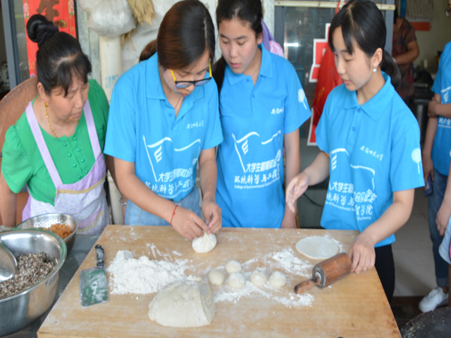 团队在队长的带领下联系了当地挞粿老字号——绩溪爱桃挞粿,并亲自观摩及体验了挞粿的制作工艺流程。经介绍,挞粿是非油煎食品, 在煎的时候基本不放油,只是将上等猪油、菜油、麻油等混入馅中,放置柴火锅上采用小火慢慢地挞。颇受绩溪当地居民喜爱的美食——挞粿从最简单的和面调馅到下锅煎挞,无不渗透着独特的民间手艺。美味的挞粿以丰富多种的馅料备受各个年龄阶层的人民喜爱,据了解,在众多馅料中,笋干,香椿最受当地人喜爱。