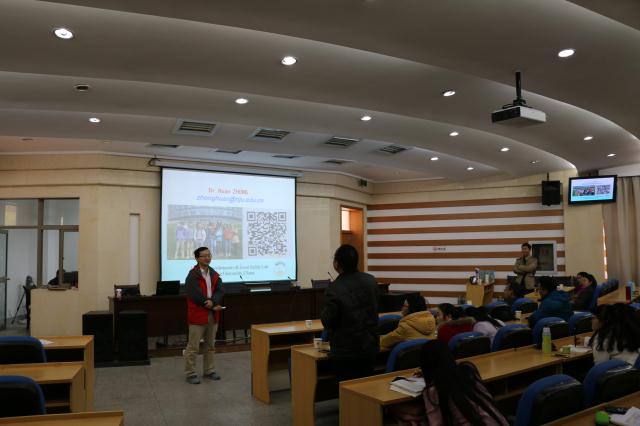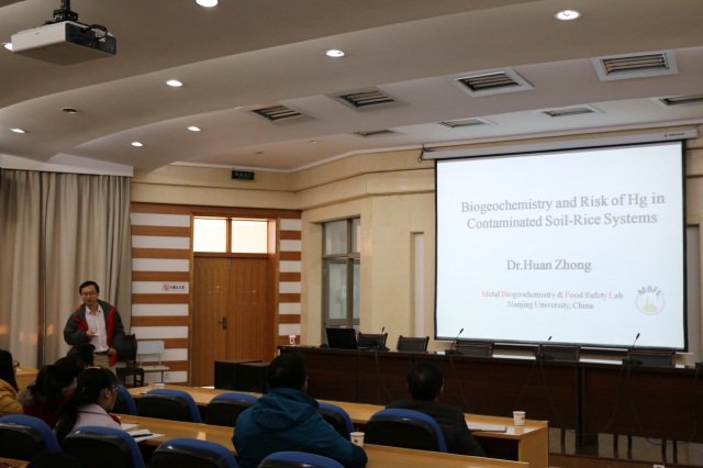 钟寰副教授从我国农业生态系统中重金属污染的现状出发,阐述了汞在土壤-水稻系统中的形态分布与风险;结合大量实验数据,分析了添加生物炭以固定甲基汞,从而减少有效态汞向水稻植株迁移的阻控措施。通过检测稻田养殖小龙虾体内汞的积累量,分析了对人体健康的潜在危害;从硒与汞的拮抗作用,探讨了硒对植物体内汞的生物学行为和生物效应的影响。整场报告深入浅出地阐述了汞污染对我国食品安全和人体健康构成的潜在风险。会后,钟寰副教授和与会师生就生物炭对有效态汞的固定作用、生物炭表面官能团的分析方法,以及生物体内汞的分布情况等问题展开了热烈讨论。