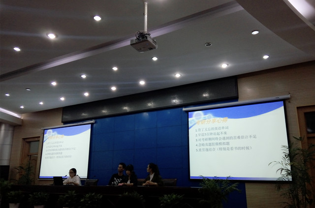 交流会现场,师兄师姐们向同学们分享了研究生生活,介绍了自己在考研时的经历和体验。就读江南大学的程亚同学向大家传授了数学、英语、政治、专业课的复习要领,推荐了考前参考书目。就读河海大学的肖雅琴同学向学弟学妹们分享了读研以来的感受,她认为读研究生给自己带来更为开阔的知识面和视野。来自东南大学的汪莲同学讲述了自己保研失败后及时调整心态,最终成功考取的心路历程。她认为考研是人生中的宝贵历练,永不放弃才是青春应有的样子。就读上海理工大学的屈紫薇同学分享了自己考前报名、考中、考后调剂的全过程,耐心讲解临考技巧、目标院校失败后如何调剂等。在场同学共同认为考研最重要的是毅力与心态,考研是个漫长又艰辛的过程,不到最后绝不轻易放弃,一定要有决心、信心,坚持到整个考研周期完成。