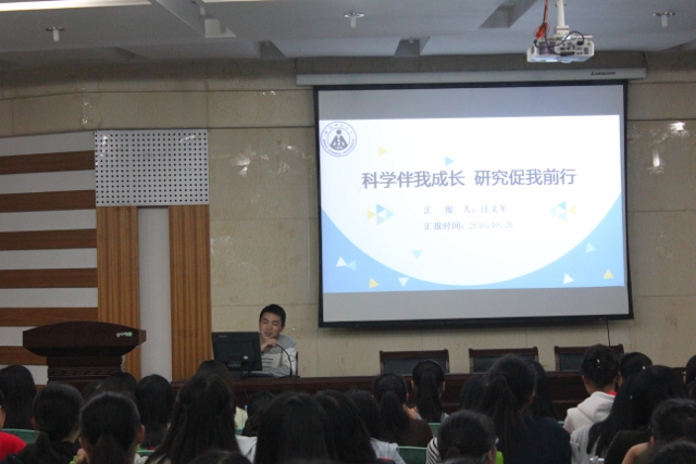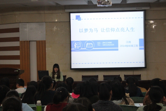 (环工公司 文/李霞光 图/王翔宇)10月20日晚,环工公司在花津校区财务处二楼报告厅举办”奋斗的青春最美丽——青春导航”报告会,辅导员李霞光老师和2016级全体新生参加。报告会邀请了在学习、工作、科研方面取得优异成绩的2013级环境工程专业陈晓、汪文军和食品质量与安全专业滕梦静,2014级环境工程专业汪路等4位同学,为2016级新生传授经验、答疑解惑。
