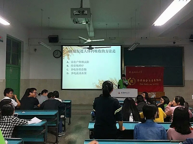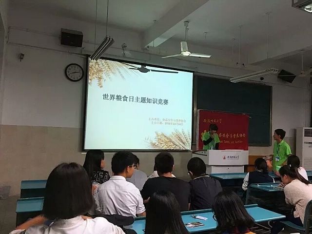 知识竞赛。10月16日晚,食协开展节粮主题知识竞赛,全体2016级食品专业员工参加。竞赛采用分组问答形式,为同学们普及“世界粮食日”的相关知识,并播放了与节粮有关的公益广告,倡导同学们节约粮食,增强同学们的节粮意识。