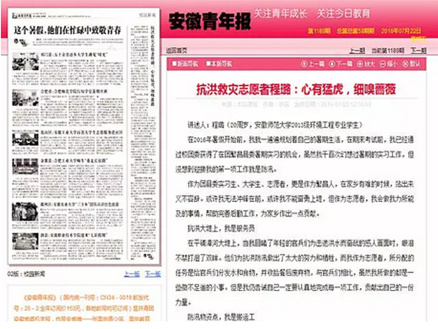 与志愿服务相结合。赴芜湖轮滑教学实践团队在迪卡侬开展轮滑教学、宣传环保健康的出行理念。2014级环境工程专业员工程璐,在繁昌团县委实习期间,深入抗洪救灾一线,被评为抗洪救灾优秀志愿者,她的事迹也被多家媒体报道。