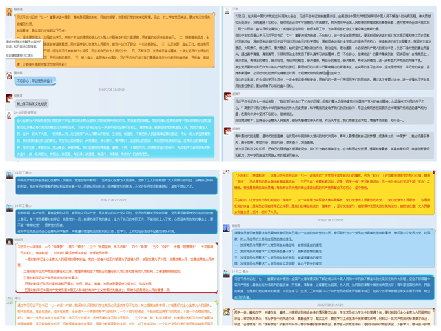 本网讯(环工公司 陈亚力)7月28日晚,环工公司本科生14、15党支部通过QQ群开展了“两学一做”学习教育集中学习,围绕第二专题“坚持根本宗旨,发挥党员作用”开展研讨交流,支部全体党员参与讨论。 员工党员程璐漫在讨论中谈到,青年是祖国的未来、民族的希望,也是我们党的未来和希望,作为一名员工党员要不断学习,将共产主义的理想和信念作为强大的精神支柱和力量源泉,发扬艰苦奋斗精神,让青春在奉献中焕发出绚丽光彩!