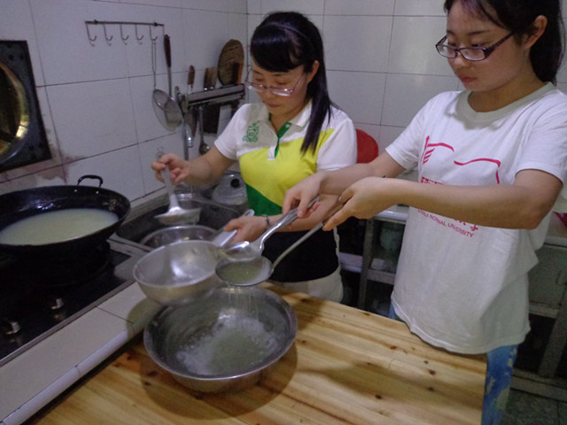 除了热辣浓厚的盐帮菜系,在炎热的蜀地自贡值得一提的还有独特的小吃饮品。14日下午,小队跟随当地居民见识了自贡小吃的丰富美味,更亲手体验了制作凉虾的生活乐趣。“凉虾” 的主要食材是大米,因其头大尾细形似虾而得名。大米制浆煮熟,用漏勺漏入凉水盆中而成,放置红糖或其他食材入料,香甜软嫩,入口冰凉,是夏季解渴佳品。