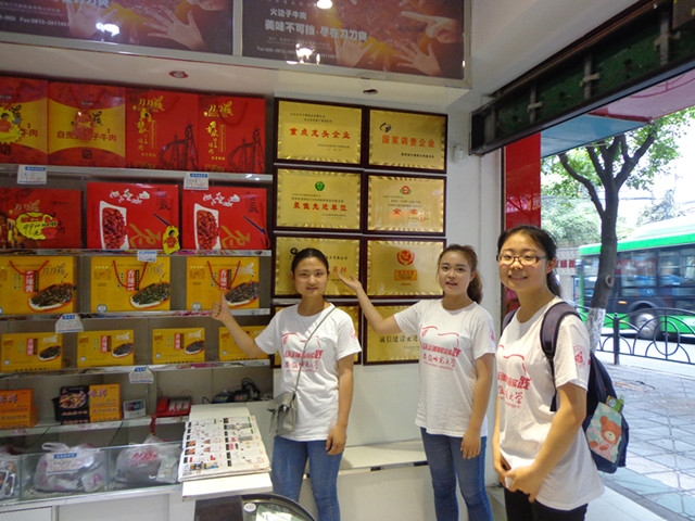随后,实践团队重点对“刀刀爽”火边子牛肉这个传统品牌进行了深入了解。店老板热情地带着队员们参观了可称重的现品以及具有精美包装可馈赠亲友的礼盒火边子牛肉。店内满墙的荣誉证书彰显了“刀刀爽”火边子牛肉的品牌实力,它是自贡市农业产业化经营的龙头产业,在第十届中国国际农产品交易会上获得金奖。火边子牛肉以其质优味美、片薄如纸、酥香绵长而闻名遐迩,火边子牛肉源于清乾隆年间,其200多年的历史以及严格的选料、精细的刀工和独特的风味使其在中华民族饮食文化中成为不可替代的一员。火边子牛肉以其完美的色、香、味抓住了食客们的味蕾,它所体现的锐意改革、敢于冒险的自贡精神更使火边子牛肉的价值上升到一个值得永世流传的高度。