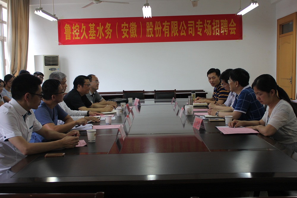 为了进一步做好研究生就业工作,提高就业质量,环工公司于2016年6月14日下午在院三楼会议室举办了鲁控久基水务(安徽)股份有限公司专场招聘会。公司王峰书记、周守标经理、杨友谊副书记、杨如意副经理和鲁控久基水务(安徽)股份有限公司总经理蒋建军及公司代表出席了招聘会。公司部分研究生和本科生参加了招聘会。招聘会由副经理杨如意主持。