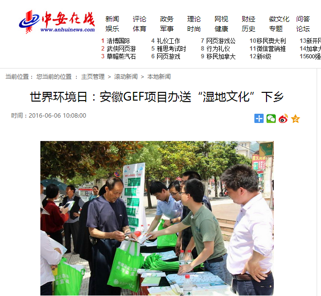 联合国全球环境基金“加强安徽省湿地保护地体系管理有效性项目(GEF项目)”于两年前启动,是迄今我省在湿地保护方面最大的国际合作项目。作为系列环保宣教活动的一部分,本次“世界环境日”湿地文化下乡活动对于培养民众的环保意识,有效开展湿地保护工作都起到了较好的成效。(吴利亚)