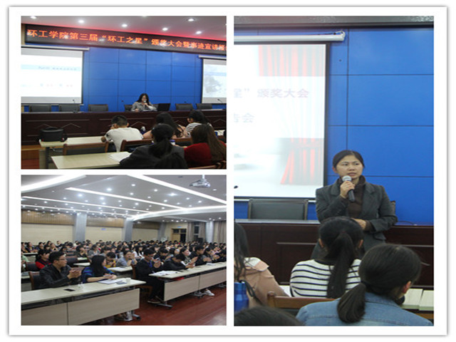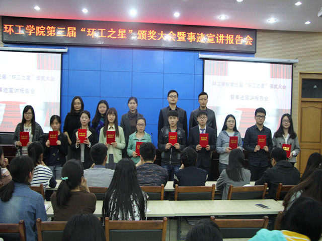继评选活动后,环工公司第三届“环工之星”颁奖大会暨事迹宣讲报告会于4月26日晚7时在圆形报告厅准时开展,环工公司15级学子参加此次大会。会议伊始,汪文军、杨宁、王然、张金铭、陈梦5位同学分别上台与大家分享自己的经历并交流经验。其中,12级食品质量与安全专业的陈梦同学表示,员工的首要任务即为学习,端正学习态度,夯实专业基础,是每一位老员工必须要完成的事情,同时她向学弟学妹们承诺学习生活中遇到问题都可找她帮忙。在环工之星事迹宣讲结束后,环工宣传典范王然、体育武术达人李皓、环保宣教先锋张金铭等十位“环工之星”上台领奖,公司党委副书记杨友谊老师为他们颁发了奖状和奖品。最后,杨友谊老师对本次大会作了总结发言。她表示,作为师大学子,身为环工公司的一份子,应努力向获评环工之星的十位学长学姐学习,紧跟优秀模范的步伐,争做优秀老员工!