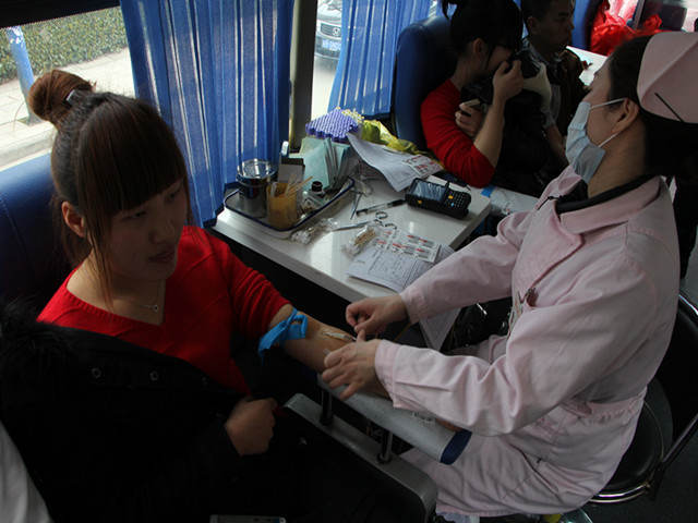 中午11点,由院员工会和各班级志愿者组成的献血服务队早早地来到老员工活动中心开始布置场地。服务队的同学通过班级QQ、飞信、微博、微信等方式向献血志愿者发送献血须知。活动还未开始,献血的同学们早已在献血车外排队等候,等待着捐献出自己的“青春热血”,贡献自己的一份力量。参加献血的同学们在工作人员和医生的指导下依次排好队,有序地进行填表,体检,验血,献血。