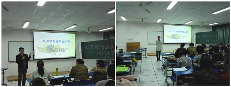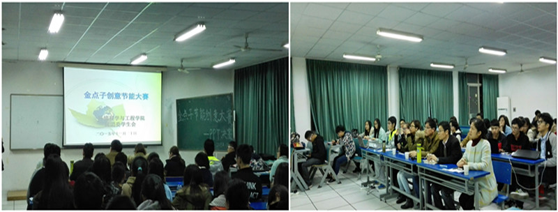(本网讯/环工公司团委)引领绿色新风尚,玩转节能“金点子”。为倡导环境保护与践行绿色生活,增强环工公司员工节能意识与动手动脑能力,丰富同学们的校园文化生活,环工公司于2015年11月开展了以“引领绿色新风尚,玩转节能‘金点子’”为主题的首届“金点子”节能创意大赛。11月20日晚19时,“金点子”节能创意大赛的决赛在环科实验楼201教室展开。出席本次创意大赛决赛的评委老师有公司党委副书记杨友谊老师、环境专业教师陶海升老师、15级环境科学专业班主任刘畅老师、15级食品质量与安全专业班主任程新峰老师、15级食品科学与工程专业班主任李宁老师、15级辅导员陈亚力老师。14级和15级员工代表观看了整场比赛。