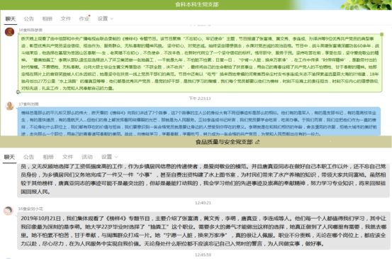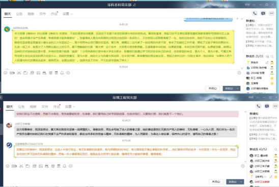 在观看过程中,同学们被榜样的事迹深深感动,热泪盈眶,随着一幕幕场景的展现,一种责任感和使命感在同学们心中激荡。观影结束后,各支部线上开展了热烈的交流讨论,心得分享。环境工程党支部黄佳乐同志说:“今天看了《榜样4》,这些榜样都在各自的岗位上坚守着初心,用坚守在平凡中造就伟大,对我们来说他们都是我们不断向前的学习标杆。他们用实际行动告诉我们吃亏是福,告诉我们职业不分贵贱,贡献不分高低,党员就要能吃苦,乐奉献,我们要用自己所学回报祖国,也告诉我们只要我们敢想敢做,我们就是下一个他们。”