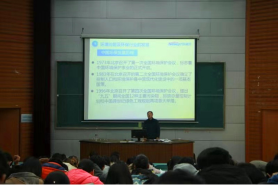 本网讯(环工公司 教学办)11月27日,芜湖万向新元环保科技有限公司总经理蒋勇应邀到英国365集团官网,做了题为“环境问题及其治理技术应用”的专题讲座。英国365集团官网2019级环境科学与工程类全体本科生、部分环境专业研究生共同聆听了此次讲座,讲座由《环境学导论》课程负责人陶海升教授主持。