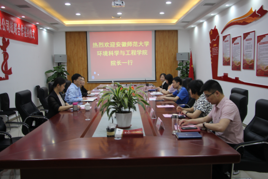 座谈会上,安徽国科检测科技有限公司董事长邵栋梁对周守标经理一行的到来表示热烈的欢迎,初步讲解了国科检测公司的基本情况。经理周守标向安徽国科检测科技有限公司的与会领导介绍了公司的办学情况、团队队伍以及公司基本情况。公司总经理助理刘牛妞从公司发展、基本业务、团队情况等方面进行了详细介绍。邵栋梁表示欢迎优秀的环工学子到安徽国科检测科技有限公司实习、就业,希望双方今后在人才培养、项目申报、课题研究、产学研合作等方面进一步加强交流。