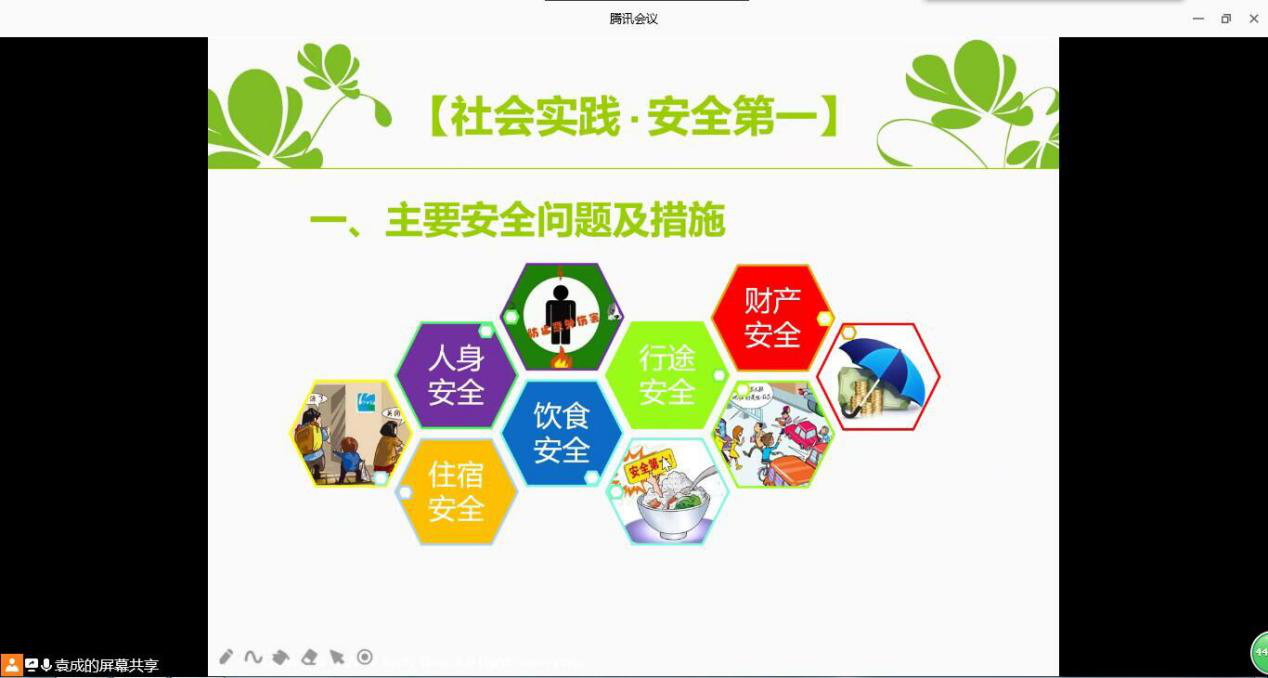 公司2017级李静同学分享了2019年暑期社会实践的经历,为与会人员介绍暑期社会实践中的详细情况和注意事项,包括团队成员的任务分配和关系协调等方面。随后,袁成老师为各团队举行2020年暑期社会实践专项培训和安全培训,向大家介绍了班级(宣传委员)-团队(宣传员)-公司(志愿服务团队)的宣传机制,并分享了投稿的注意事项和相关网站。在安全培训中强调了安全问题的重视性,要求树立安全防范意识,建立健全安全管理机制,每日进行上午和晚间的两次零报告,并列举常见突发状况的处理方法。