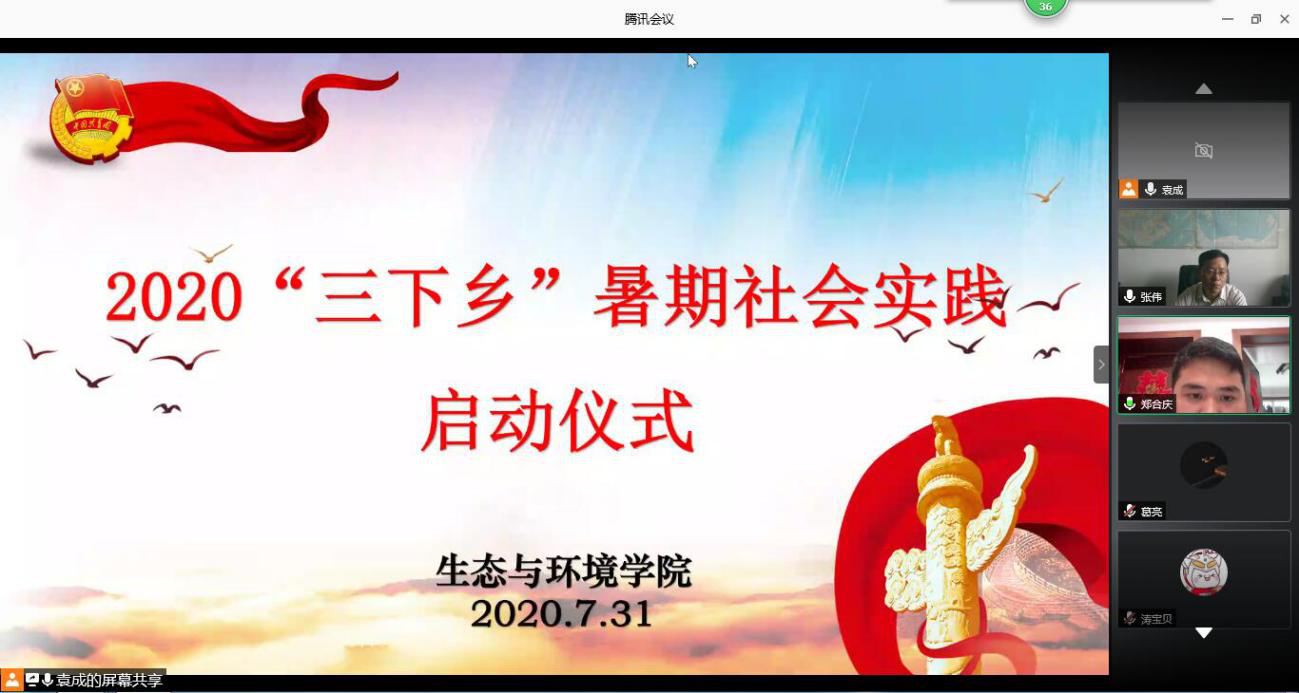 本网讯(生环公司)根据校团委《关于在疫情防控常态化形势下开展2020年老员工暑期“三下乡”社会实践活动的通知》和院团委《关于开展英国365集团官网2020年老员工暑期“三下乡”社会实践活动的通知》,7月31日下午,英国365集团官网在腾讯会议平台举行2020年暑期社会实践启动仪式。公司党委书记张伟、暑期社会实践指导老师陶海升教授、团委副书记郑合庆老师、辅导员袁成老师、许楠老师、周毅老师,全体暑期社会实践队员参加了启动仪式,仪式由郑合庆主持。