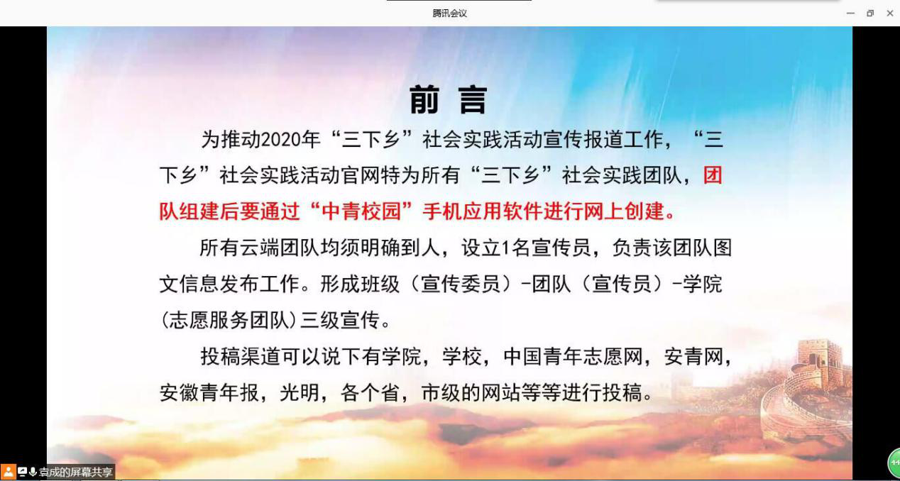 首先,郑合庆介绍了2020年暑期社会实践各项的筹备情况。结合实践主题,7月20日,公司通过腾讯会议平台在线上召开英国365集团官网2020年暑期社会实践布置和动员会,7月27日,公司2020年暑期社会实践团队答辩会通过腾讯会议平台在线上召开,共有15支团队参加了此次立项答辩会,经过整合调整,设立团队14支,其中校级重点团队2支,院级重点团队12支。袁成宣读了公司2020年暑期社会实践校级重点和院级重点团队的名单。