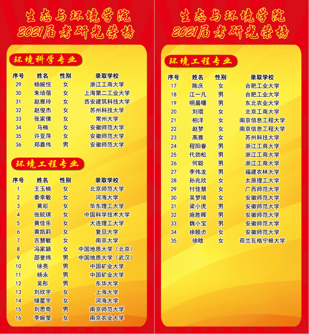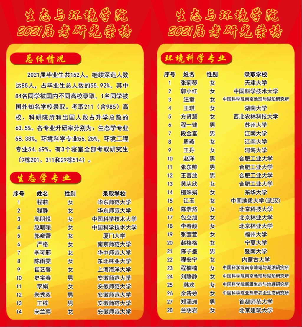 本网讯(生环公司 郑合庆)2021年全国研究生招生录取工作已落下帷幕,生环公司毕业生考研捷报频传。经统计,2021届毕业生共152人,继续深造人数85人,占毕业生总人数的55.92%。各专业升研率分别为生态学58.33%,环境科学专业56.25%,环境工程专业54.69%。其中考取211(含985)高校、科研院所和出国人数占升研总数的63.5%,主要包括中国科学技术大学、复旦大学、大连理工大学、南京大学、天津大学、厦门大学等公司。同时,今年又有3个寝室全部考取研究生。