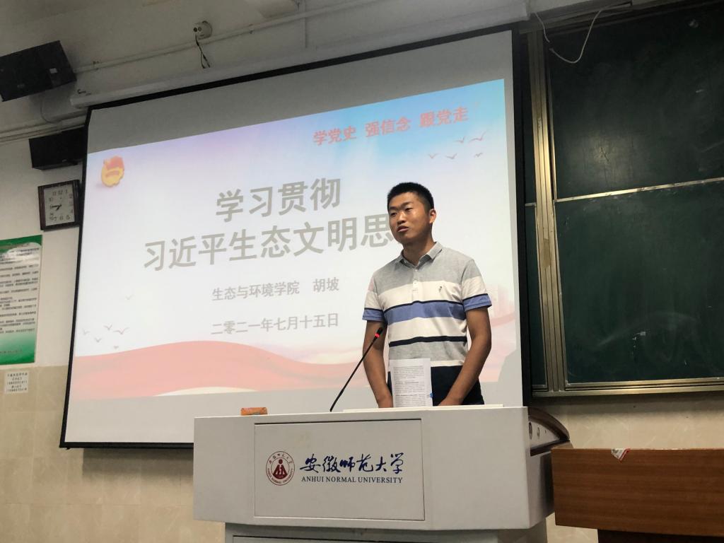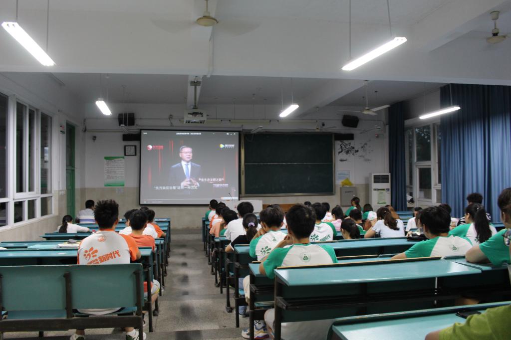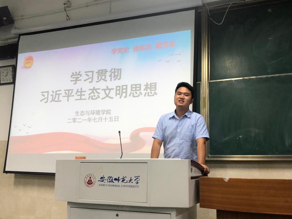 郑合庆指出本次活动是为了让同学们更深刻地学习习近平生态文明思想,并结合暑期实践活动推进学习和宣传习近平生态文明思想,提高全民环保意识。随后,与会人员集体观看《这就是中国》第93集:走生态文明之路。胡坡带领员工结合资料学习了习近平生态文明思想的发展历史和基本内涵,他介绍了生态文明建设在中国的发展历程,讲解了习近平生态文明思想的基本内涵,号召同学们结合所学专业,认真领会习近平总书记在庆祝中国共产党成立100周年上的讲话精神,为坚持人与自然和谐共生,协同推进人民富裕、国家强盛、中国美丽奉献自己的一份力量。