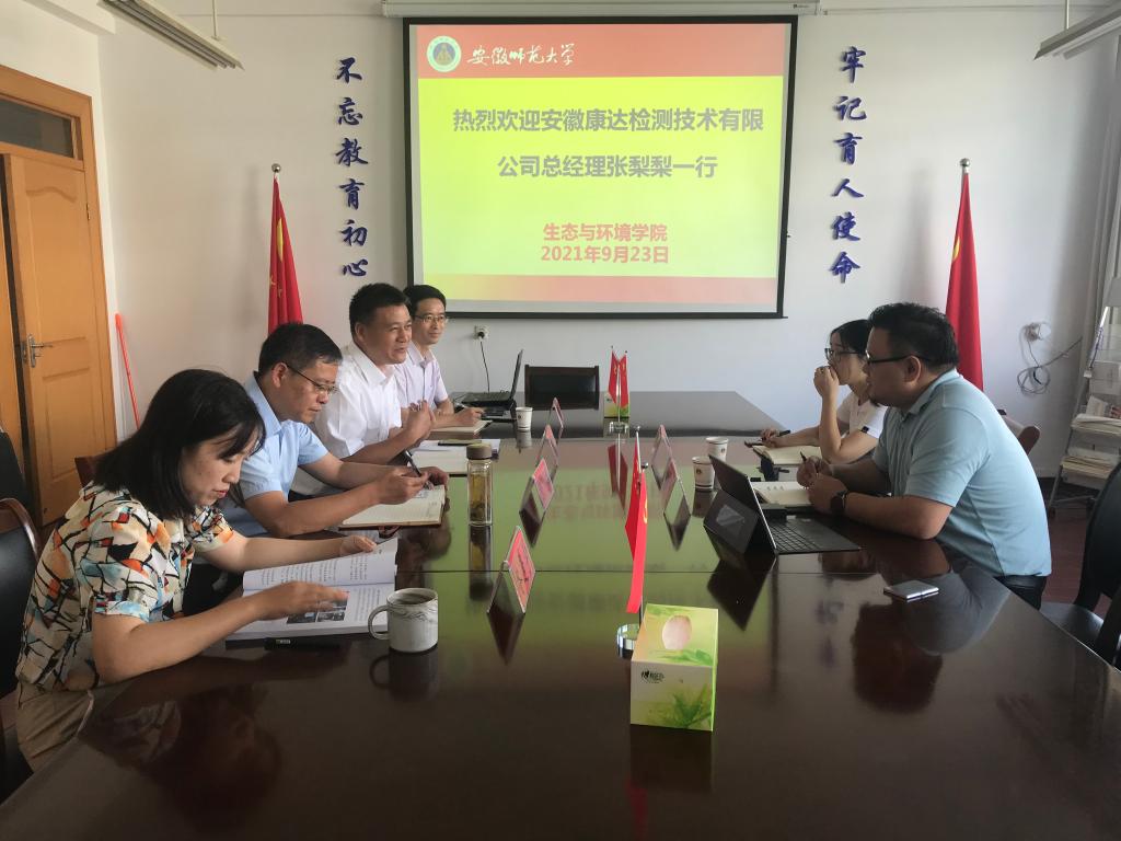 本网讯( 生环公司 于红梅)9月23日上午,安徽康达检测技术有限公司总经理张梨梨、公司分析测试中心主任王慧玲一行来院开展校企合作交流。公司党委书记张伟、经理胡好远、副经理昝逢宇、董宗木副教授参加了交流活动。
