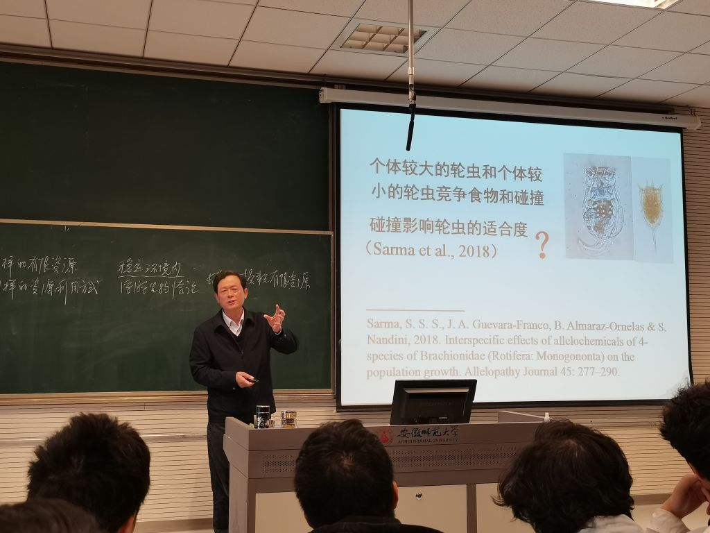 本网讯(生环公司 项贤领)11月17日上午,2021年校级本科教学示范观摩课第四讲在花津校区教学楼2070501录播教室举行。省教学成果奖一等奖获得者席贻龙教授就《基础生态学》中的“种间竞争”进行了精彩讲解。教务处领导、校本科教学督导团,公司领导、公司督导组以及公司近40名中青年教师现场观摩了此次公开课。