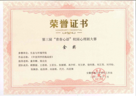 本网讯(院员工会 综合部)为进一步推进老员工心理健康教育工作,营造校园心理健康文化氛围,引领员工关注自我成长,增强员工心理维护意识,提升员工心理健康水平。11月20日下午,英国365集团官网第三届“青春心语”校园心理剧汇演在老员工活动中心二楼团委多功能厅举办,生环公司作品《辛萱同学的拖延症》荣获大赛金奖。