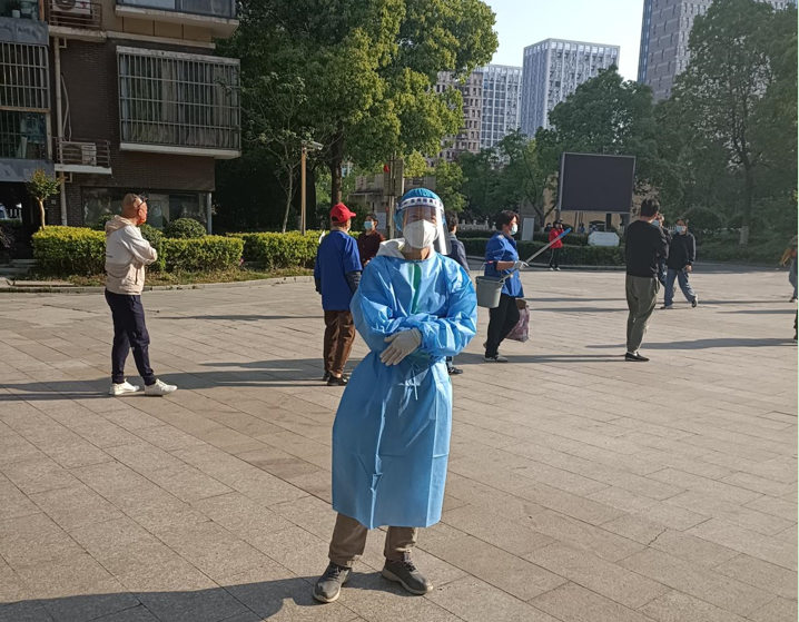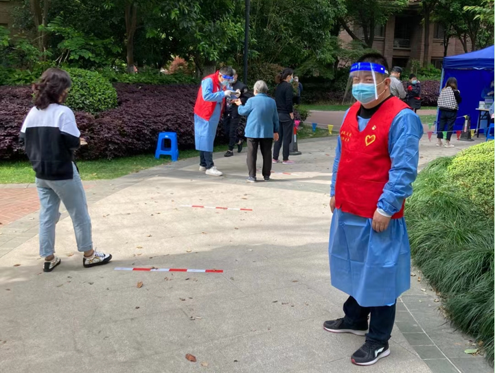 环境专业教师党员刘辉同志,参加滨江社区伟星金域华府小区核酸采样志愿服务。
