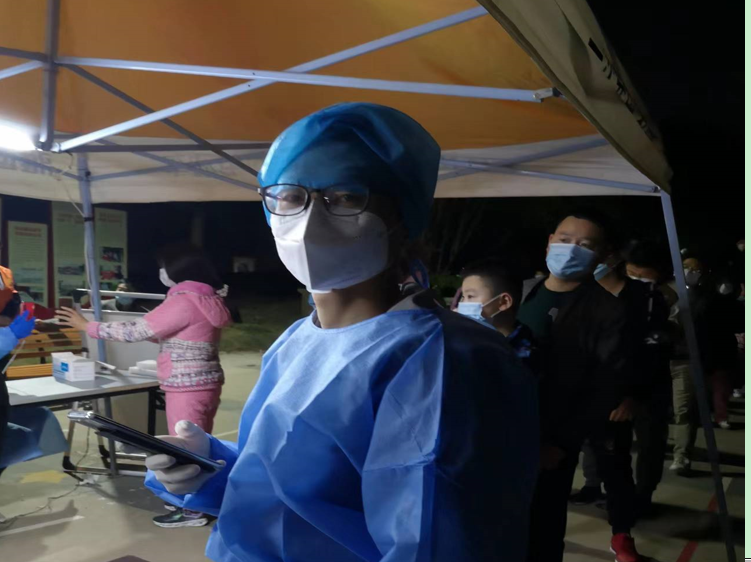 实验中心杨耿老师,参加丽城社区文津花园小区核酸采样志愿服务。