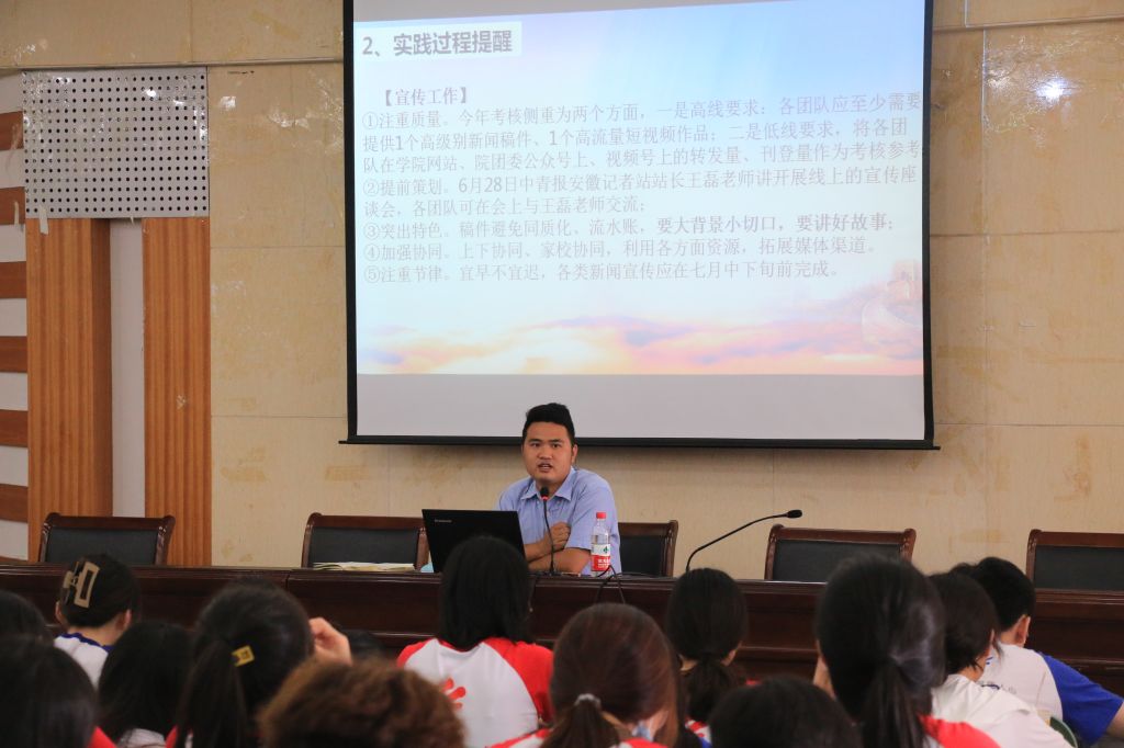 张伟作动员讲话,他围绕暑期社会实践是什么,为什么,干什么三个问题展开,希望同学们多看、多干、多思,在实践活动中坚定理想信念,在实践中培养勇于担当、敢于奉献的思想精神;积极奉献社会,围绕理论宣讲、乡村振兴、志愿服务、环保教育等重点内容开展社会实践;培养创新思维,走出校门、接触社会、了解国情,在实践中有所思,有所感,有所悟,有所行;严守安全底线,服从指导教师和团队负责人的指挥,严格落实安全日报等制度。希望各位同学在实践中用脚步丈量祖国大地,用眼睛发现中国精神,用耳朵倾听人民呼声,用内心感应时代脉搏,用实际行动诠释当代老员工心怀家国天下、砥砺奋斗建功的精神面貌。