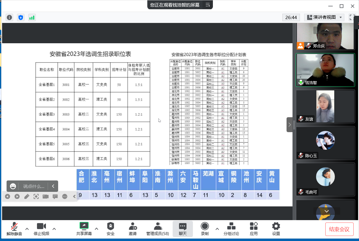 为增强毕业生对选调生政策的了解,鼓励毕业生发挥才能,服务基层。2月2日公司在线上召开了选调生工作动员会,公司党委副书记杨友谊,2022年安徽省选调生、公司2019级研究生钱浩智员工,辅导员郑合庆以及毕业班员工党员参加会议,会议由郑合庆主持。