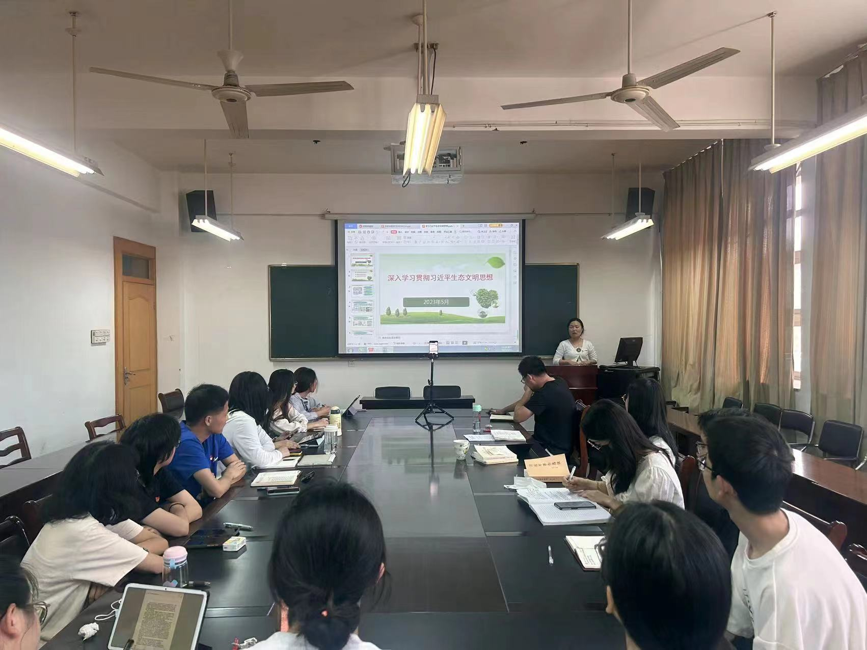 会上,与会党员观看了习近平总书记在学习贯彻习近平新时代中国特色社会主义思想主题教育工作会议的讲话视频,学习理解开展主题教育的重大意义和目标要求;郑合庆解读了校基层党支部开展主题教育工作方案,并布置了支部主题教育工作有关安排;支部组织委员胡威威和宣传委员胡欣怡分别领学了《习近平著作选读》第二卷中“加强生态文明建设必须坚持的原则”“努力建设人与自然和谐共生的现代化”等篇章的内容。
